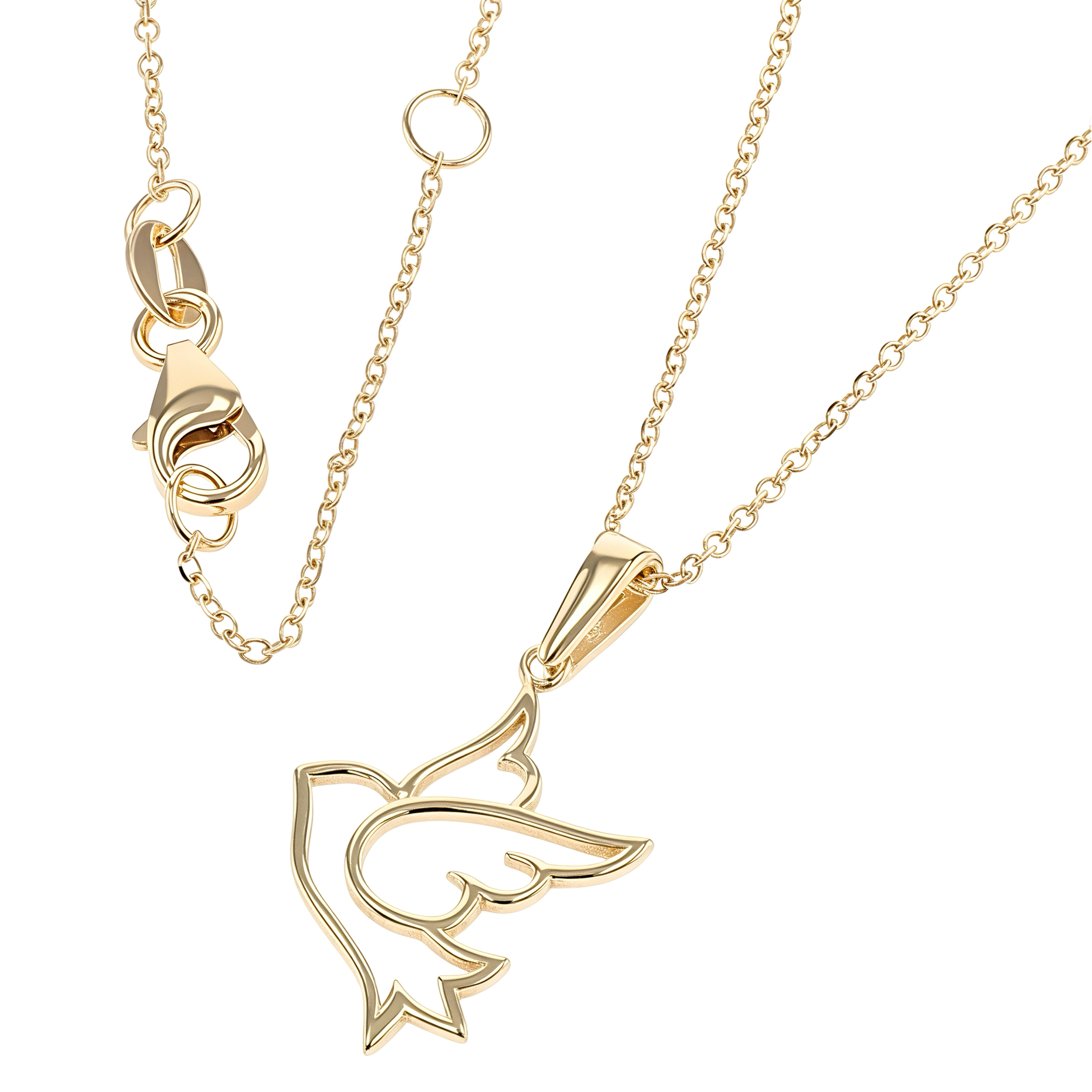 Diese edle Halskette aus 9 Karat (375) Gelbgold zeigt eine zart durchbrochene Taube , die Freiheit, Gelassenheit und Harmonie symbolisiert.