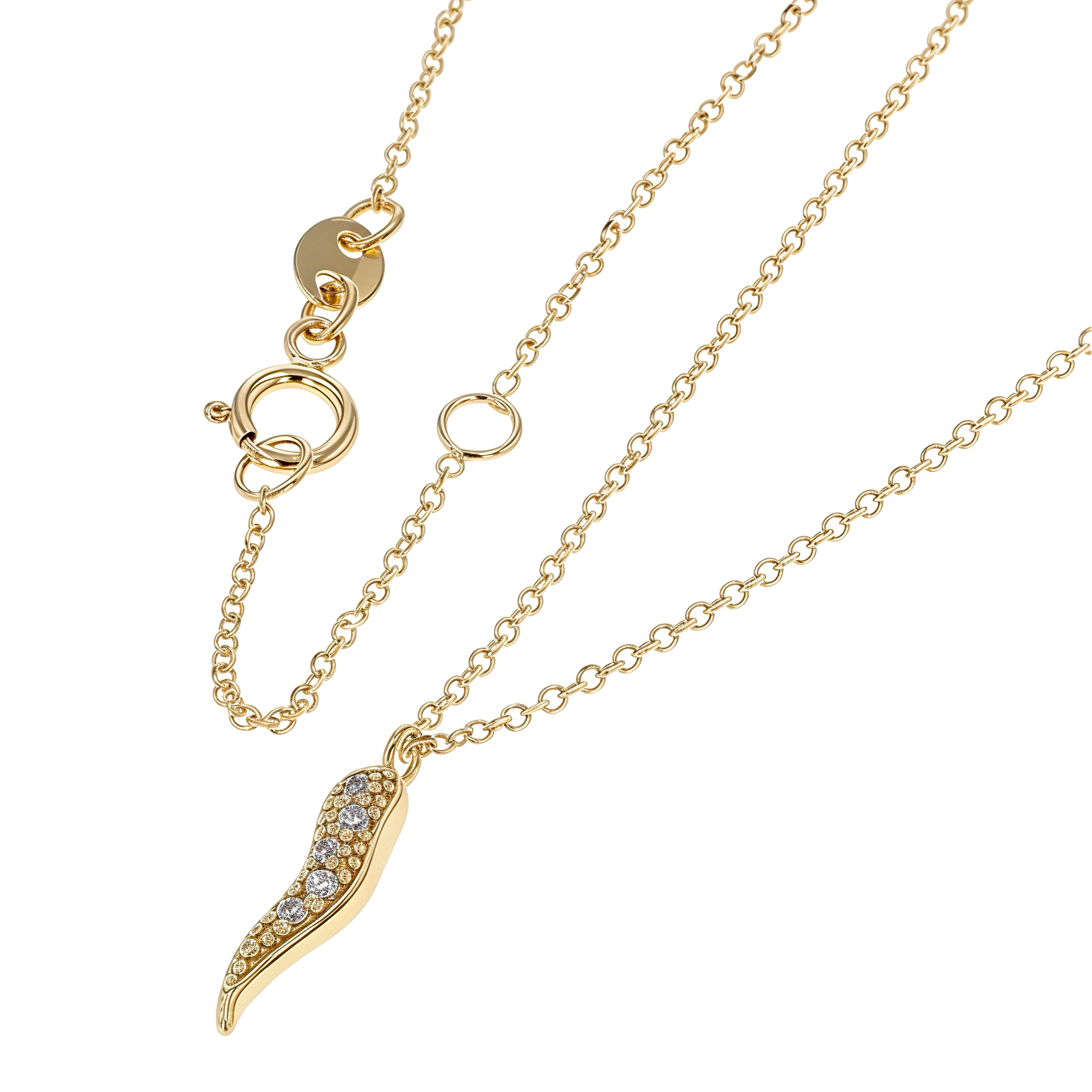 Diese zarte Halskette aus 9 Karat (375) Gelbgold verfügt über einen fein geschwungenen Anhänger, der mit funkelnden Zirkonias verziert ist.