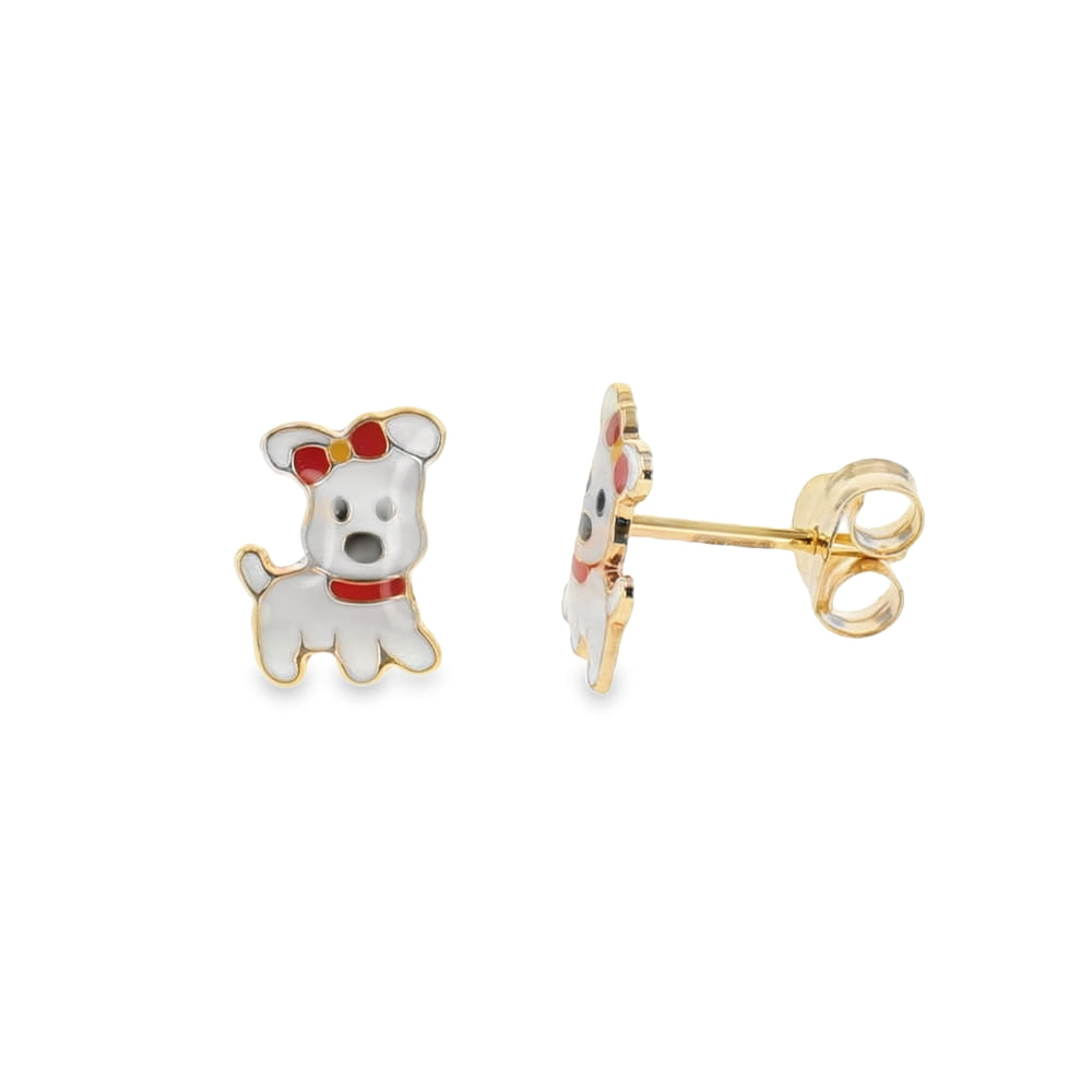 These adorable 9-carat (375) yellow gold earrings feature a white enameled puppy with a red bow and matching necklace. Playful and sweet, they're perfect for little girls who love animals.