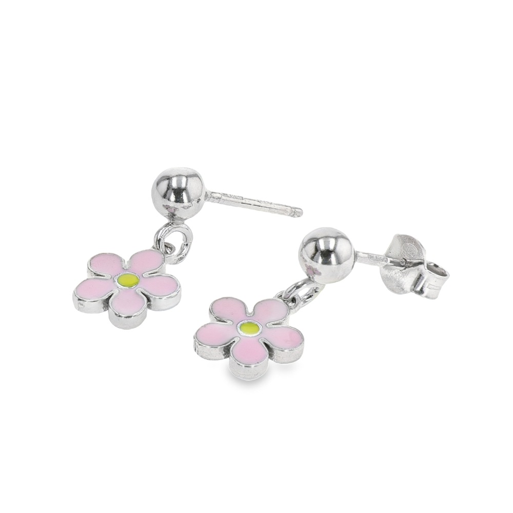 Pretty 925 silver earrings adorned with small pink enamel flowers. Their delicate and colorful design adds a touch of softness and fantasy, ideal for children. Comfortable and lightweight, they are perfect for everyday use.