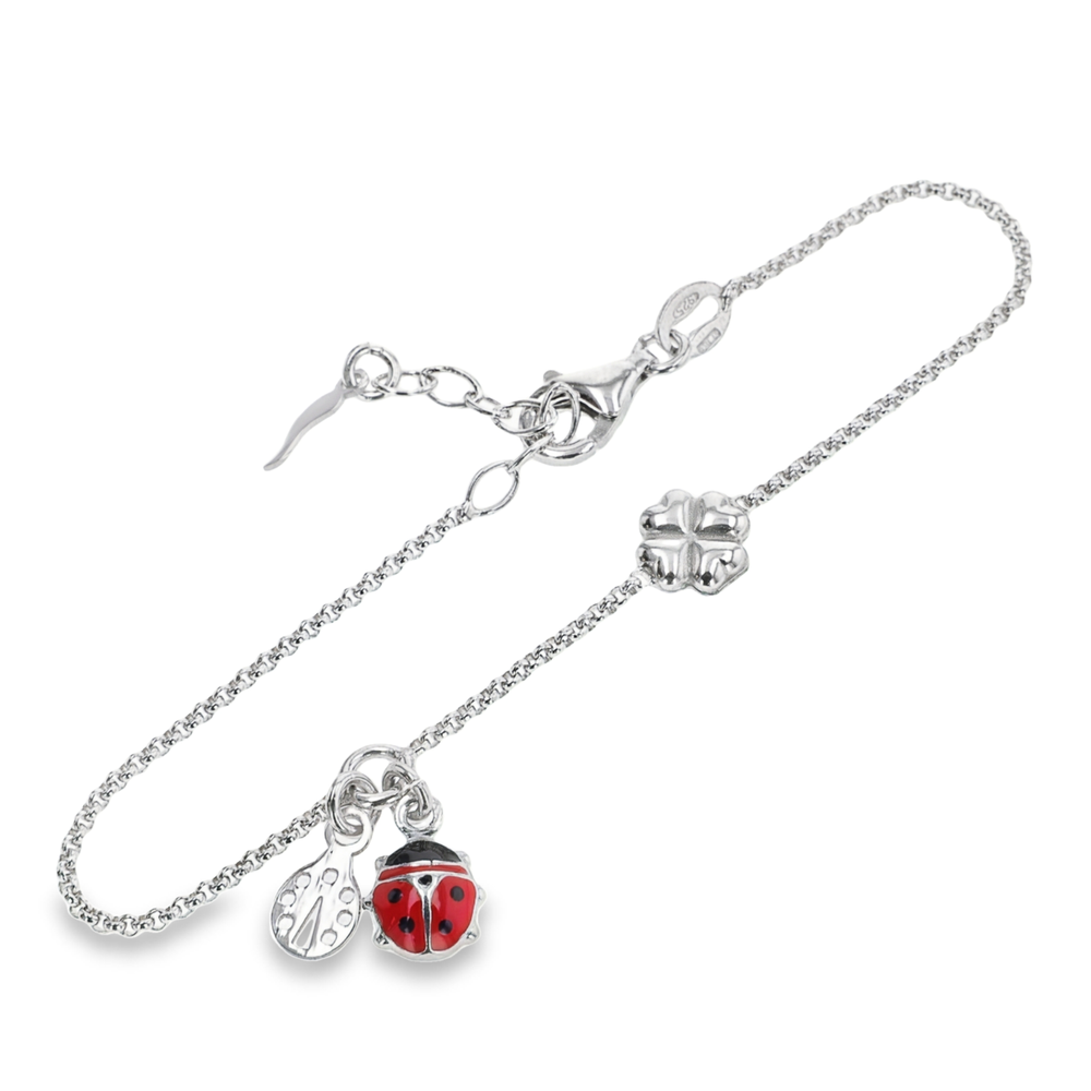 A refined and tender bracelet, specially designed for children. Decorated with a lucky clover and an adorable red enameled ladybug pendant, it symbolizes joy, luck, and protection. Perfect as a gift for a birth, birthday, or special occasion.
