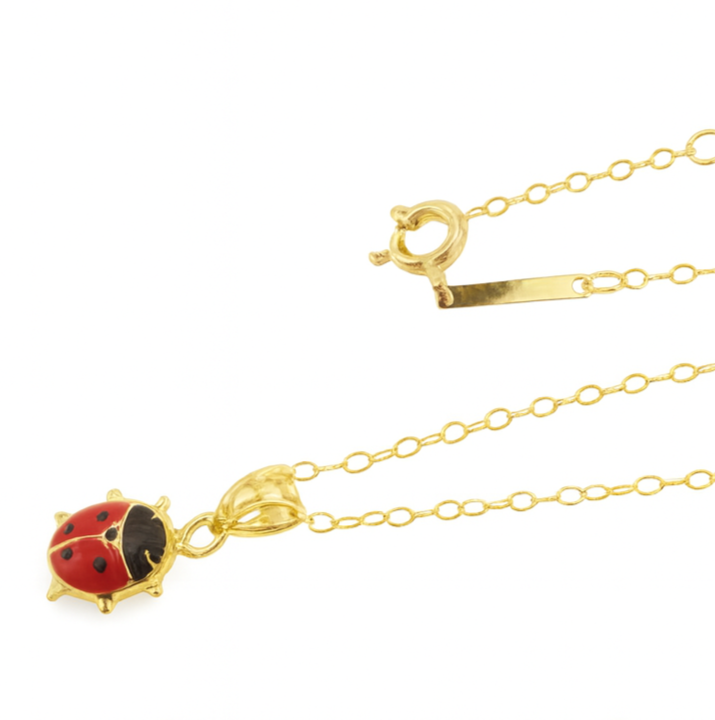 This pretty 18-carat yellow gold children's chain features a red and black enameled ladybug pendant, a symbol of luck and joy. With its adjustable length of 38 to 40 cm, it fits perfectly for little ones while remaining comfortable and secure. A delicate and colorful piece of jewelry, ideal as a gift for a special occasion.