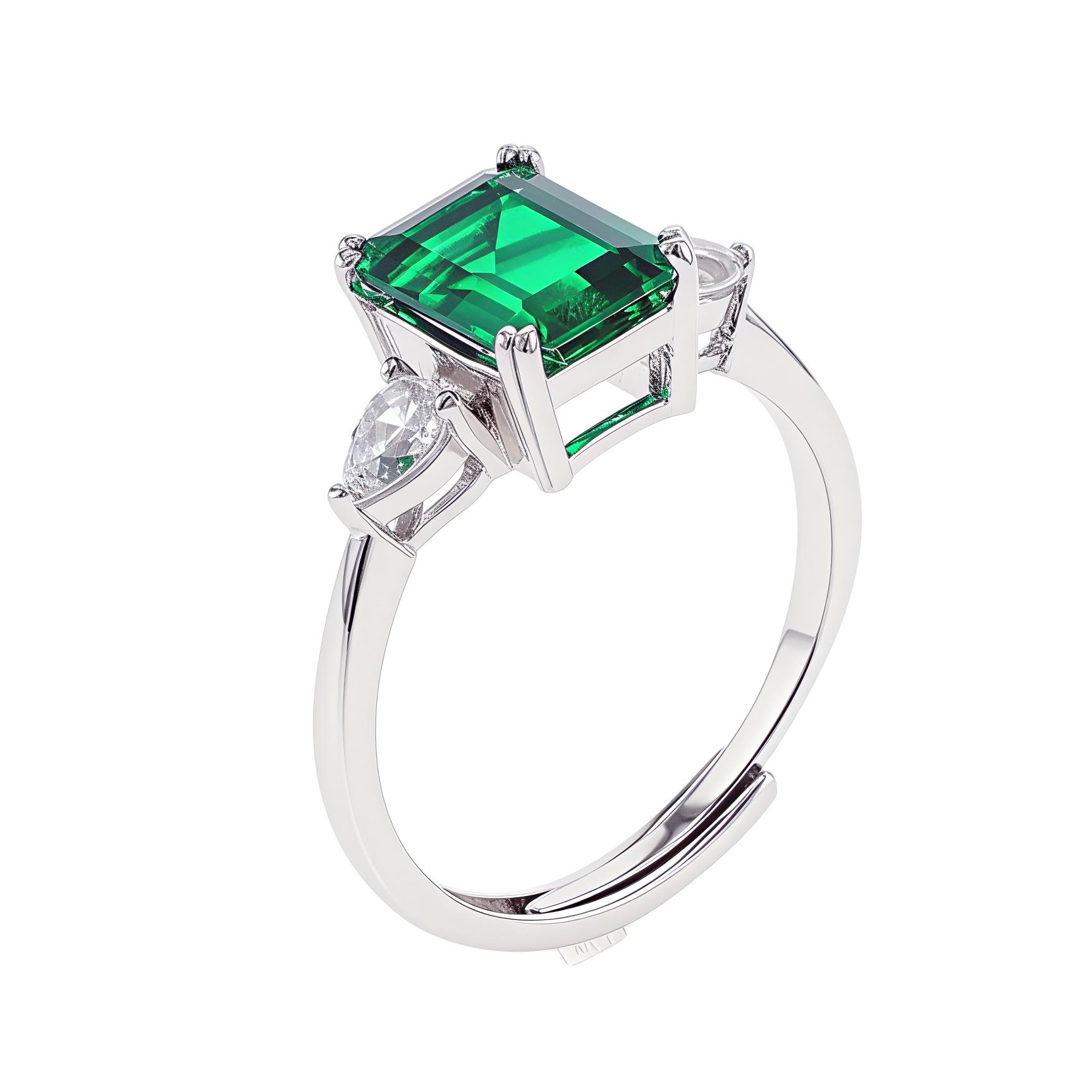 Cette bague en argent 925 se distingue par une émeraude de laboratoire taille émeraude (6x8 mm, 1.23 ct) sublimée de zirconia blancs taille poire de chaque côté.