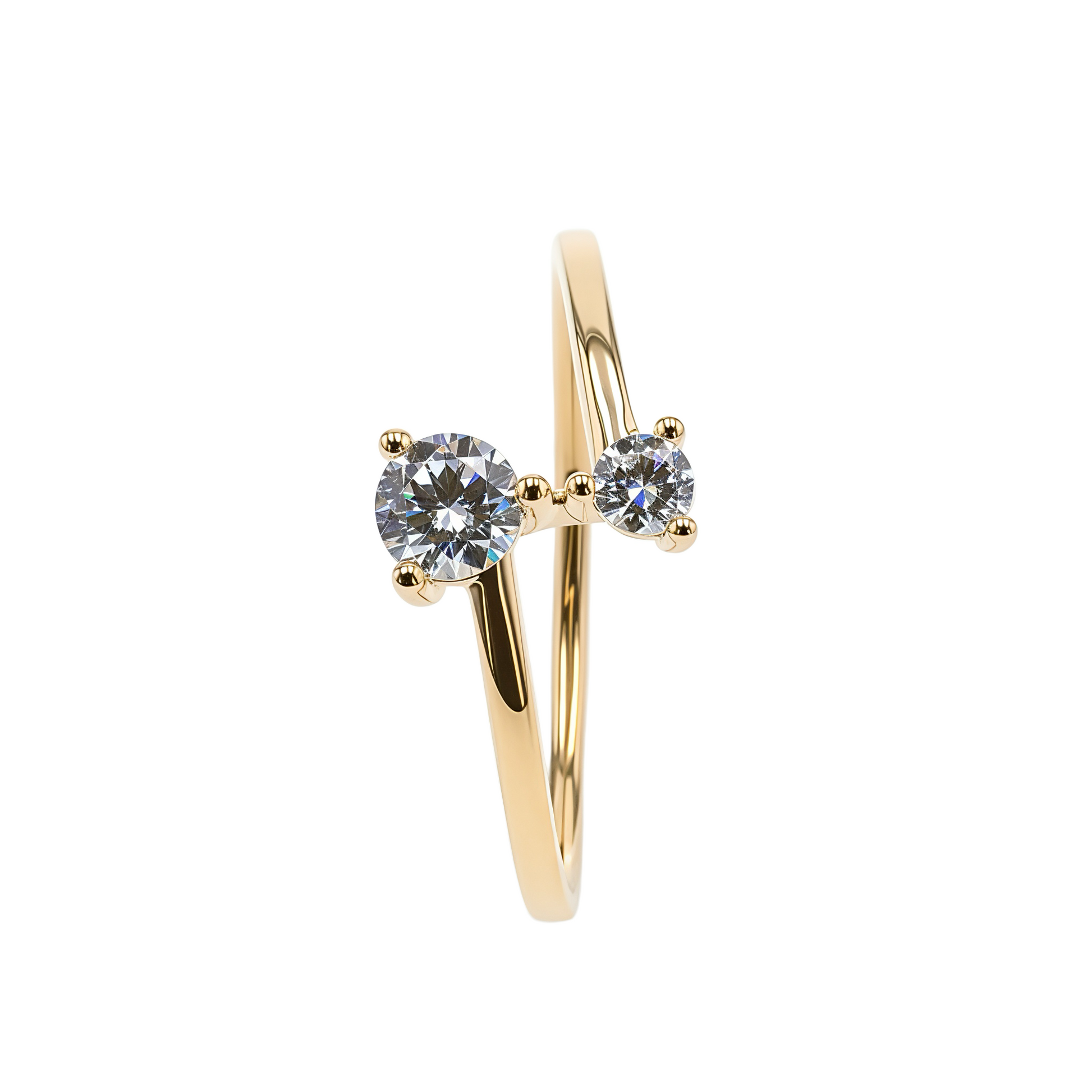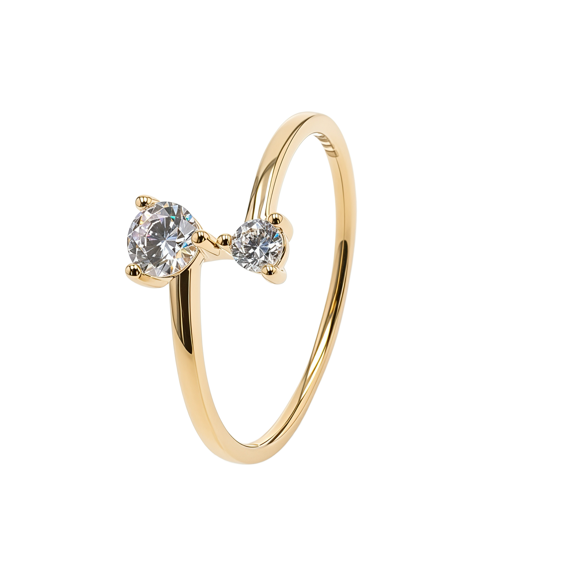 Cette bague élégante séduit par son design ouvert et ses deux pierres zirconia étincelantes de tailles différentes. Fabriquée en or jaune 18 carats certifié Fair Trade, elle allie raffinement et engagement éthique. Parfaite pour un look moderne et intemporel, elle se porte seule ou en accumulation.