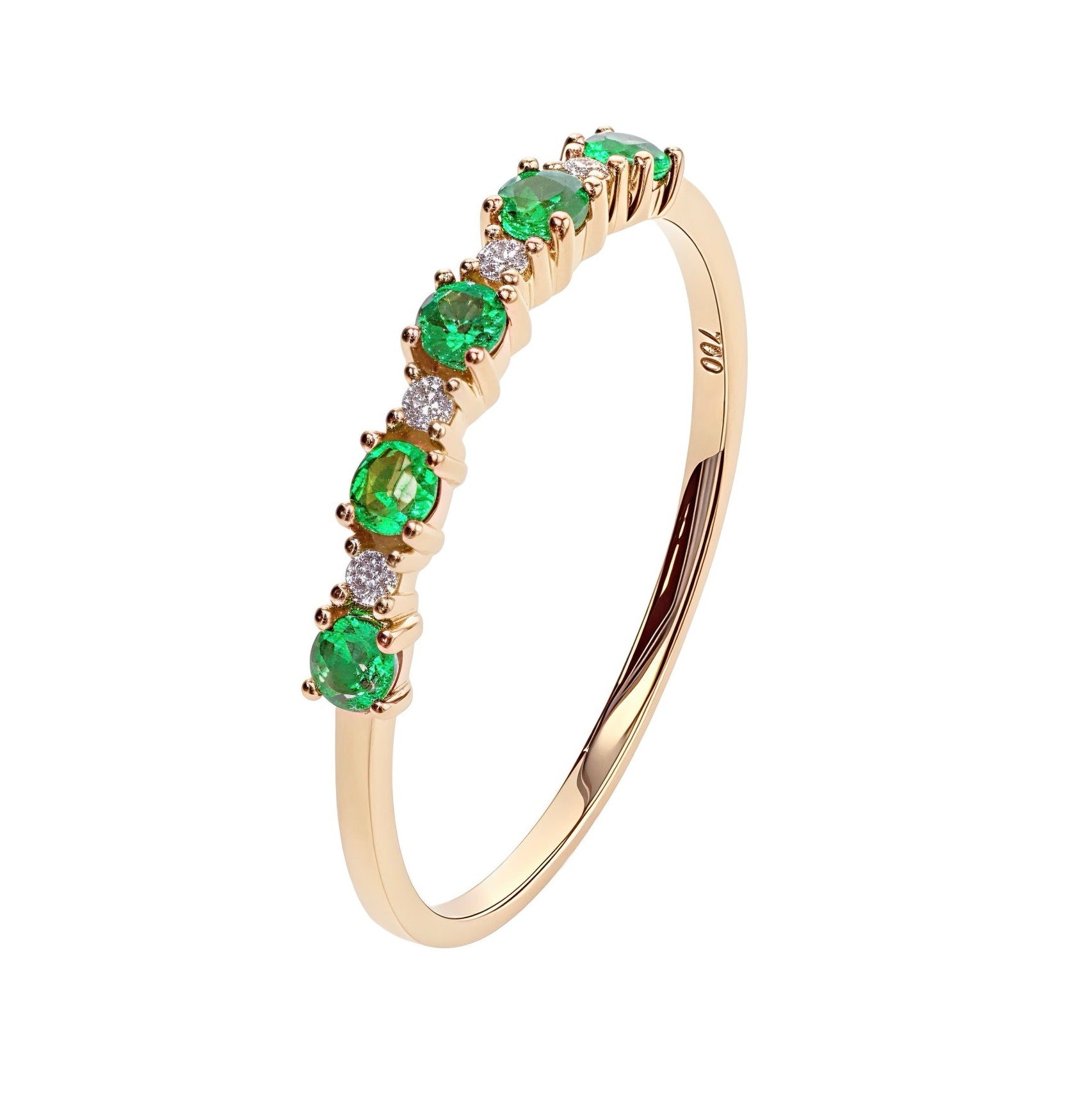 Cette bague raffinée en or jaune 18 carats (750) incarne la beauté intemporelle. Sertie de 5 émeraudes naturelles d’un vert profond et de 4 diamants étincelants, elle offre une harmonie parfaite entre couleur et brillance.