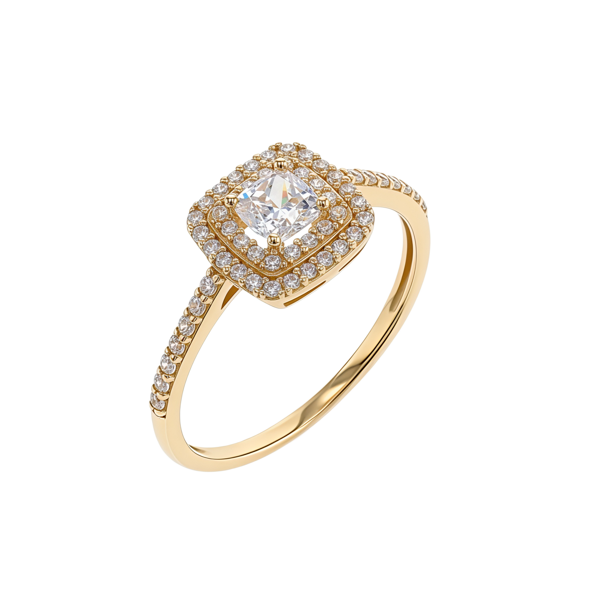 Ce somptueux anneau en or jaune 18 carats (750) met en valeur un zirconia central étincelant, sublimé par un double halo de pierres scintillantes.