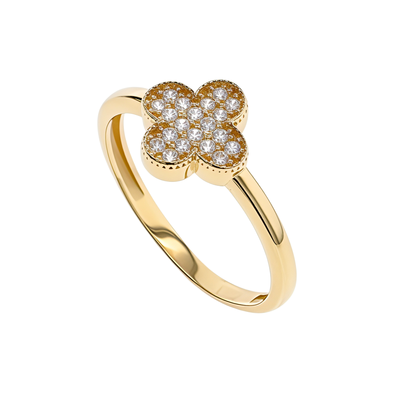 Cette bague raffinée en or jaune 18 carats (750) met en valeur un motif trèfle scintillant, serti de zirconias étincelants.