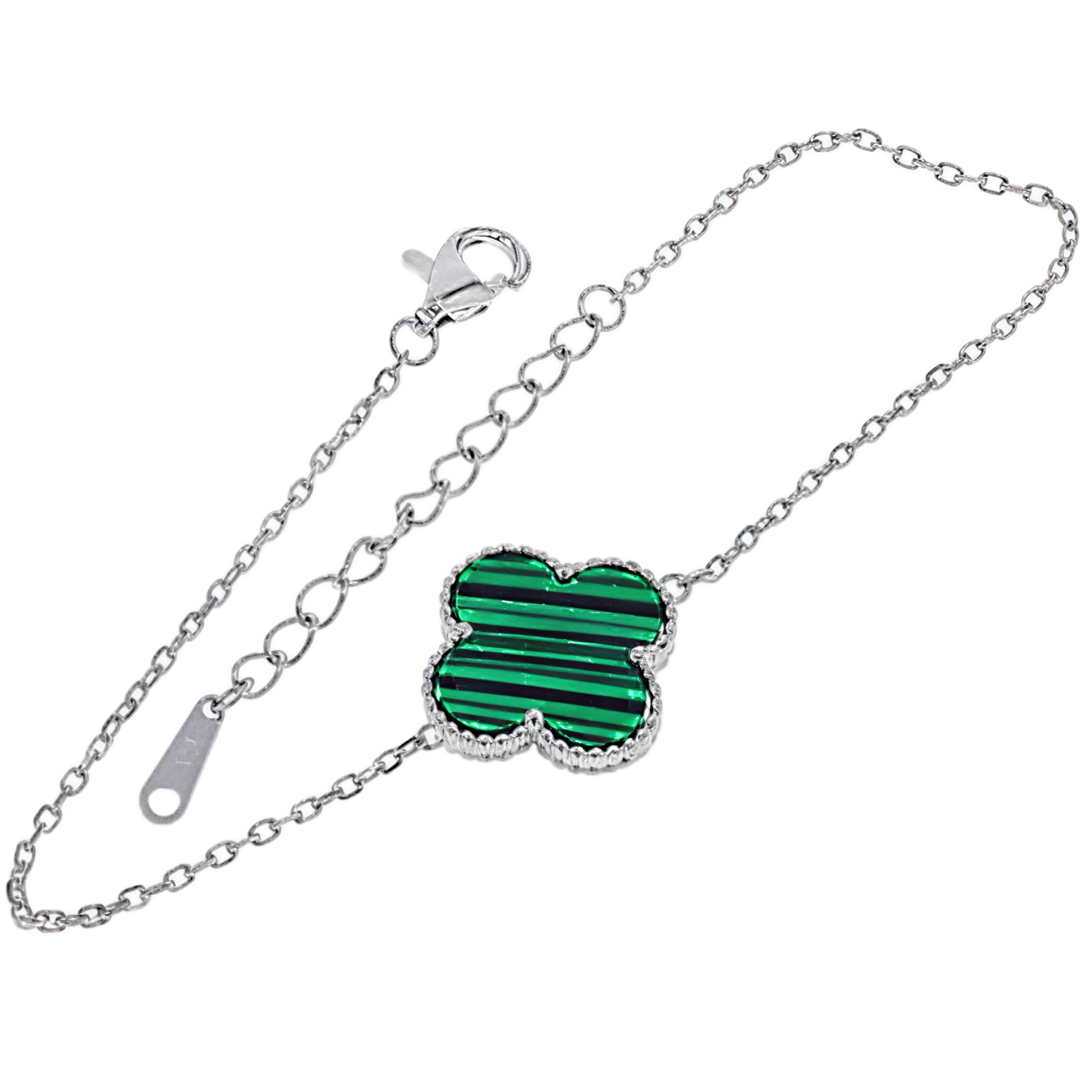 Ce bracelet en argent 925 met en lumière un trèfle vert psyn, entouré d’un délicat contour perlé. Parfait pour un look raffiné et lumineux.