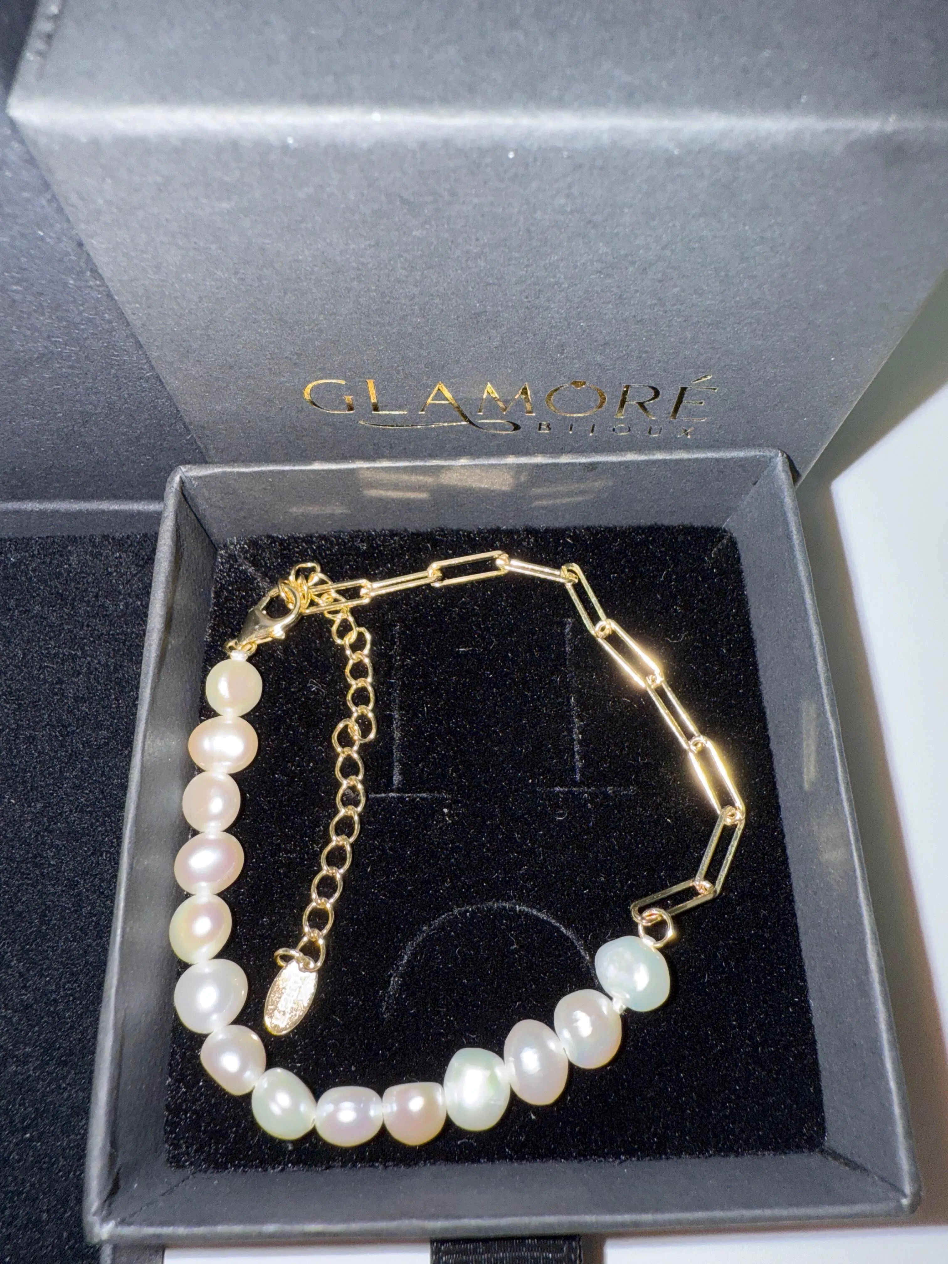 Ce bracelet raffiné associe l’élégance des perles d’eau douce à la modernité d’une chaîne en argent sterling 925 doré. Son design asymétrique, combinant des maillons fins et des perles naturelles, lui confère une touche sophistiquée et tendance.