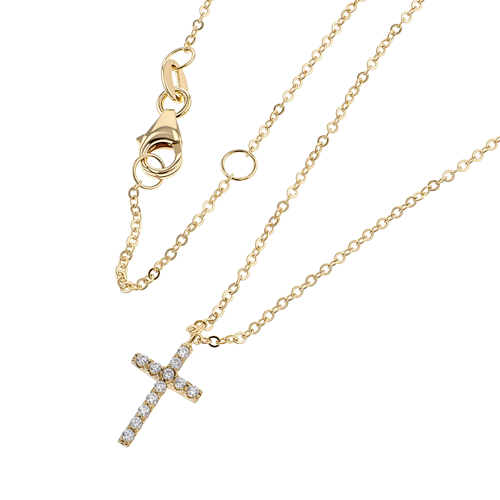 Ce collier raffiné en or jaune 18 carats (750) est orné d’un pendentif croix serti de zirconias étincelants, symbole de lumière et de grâce.