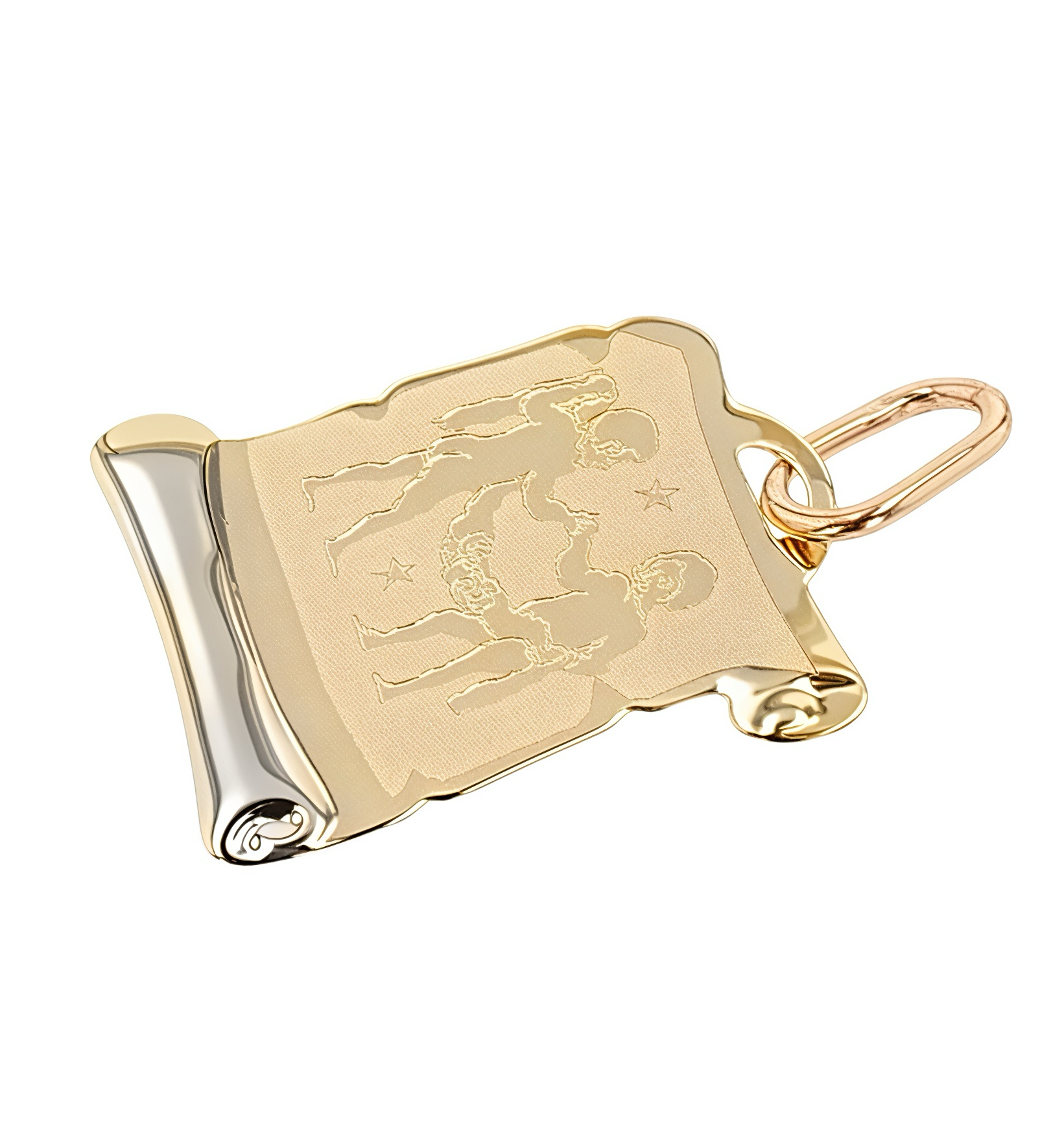 Ce magnifique pendentif en or 9 carats représente le signe du zodiaque Gemeaux avec une gravure délicate sur un parchemin en relief. Son design raffiné en fait un bijou symbolique et intemporel, idéal pour les personnes nées sous ce signe astrologique.