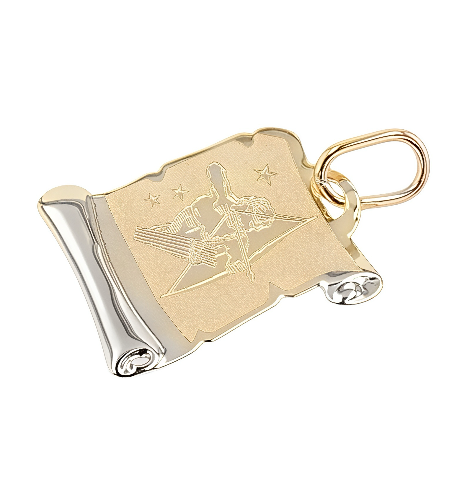 Ce magnifique pendentif en or 9 carats représente le signe du zodiaque Sagittaire avec une gravure délicate sur un parchemin en relief. Son design raffiné en fait un bijou symbolique et intemporel, idéal pour les personnes nées sous ce signe astrologique.