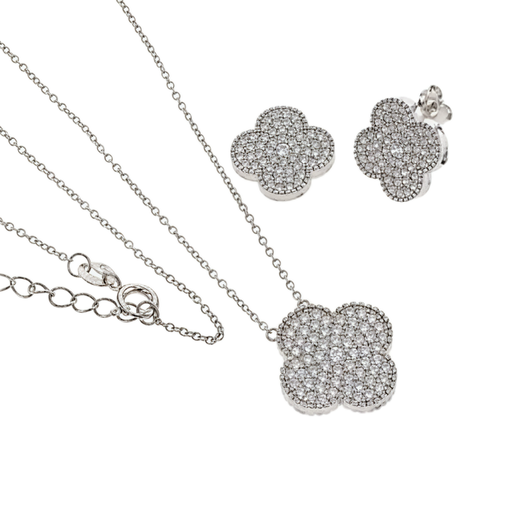Symbole de chance et de raffinement, cette parure en argent 925 présente un motif trèfle entièrement pavé de zirconia scintillants. Un bijou lumineux qui illumine votre allure avec élégance.